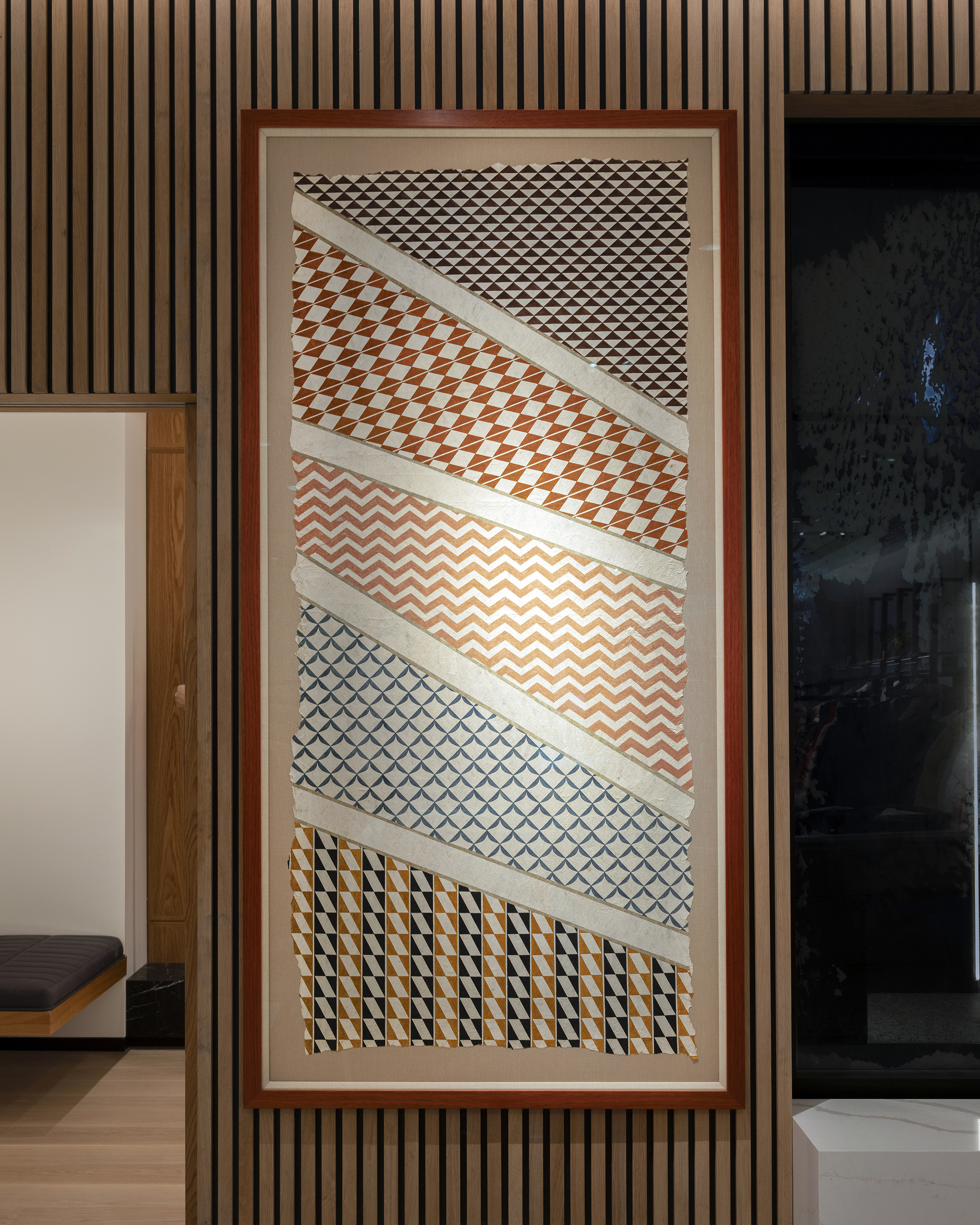 Central to the collection are works by Hawaiian artist Lehuauakea, showcasing traditional kapa (bark cloth) and ‘ohe kāpala (carved bamboo stamps). Suspended textiles, created through meticulous ancestral processes, serve as vessels of storytelling and heritage. These works engage in dialogue with Inuk prints, drawing parallels between Southern and Northern traditions through shared mark-making techniques.