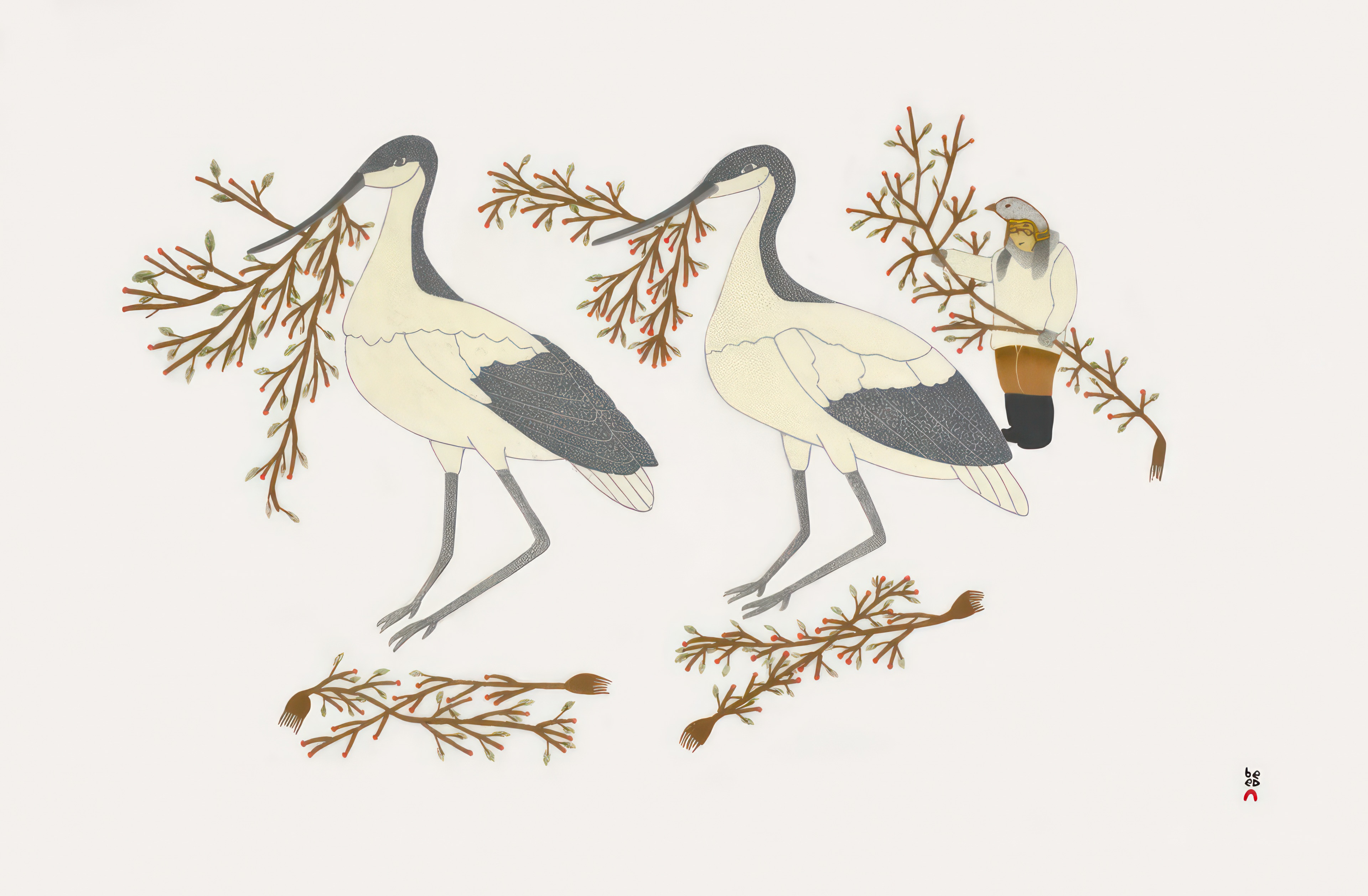 Highlights include Oloreak Etungat’s Coral Reef, a reflection on the oceanic ties of Hawaii and Arctic communities. Ningiukulu Teevee’s Heading Home captures intergenerational closeness, while Qavavau Manumie’s Collecting Berries introduces Inugagulligaq—mythical little people from Inuit legend, passed down through generations.